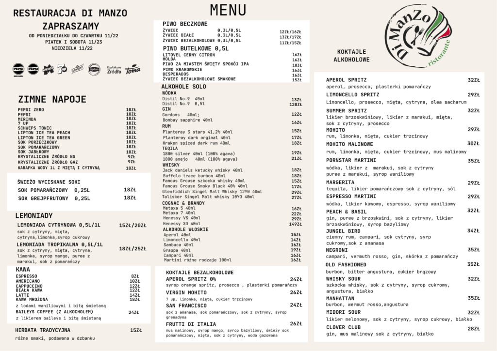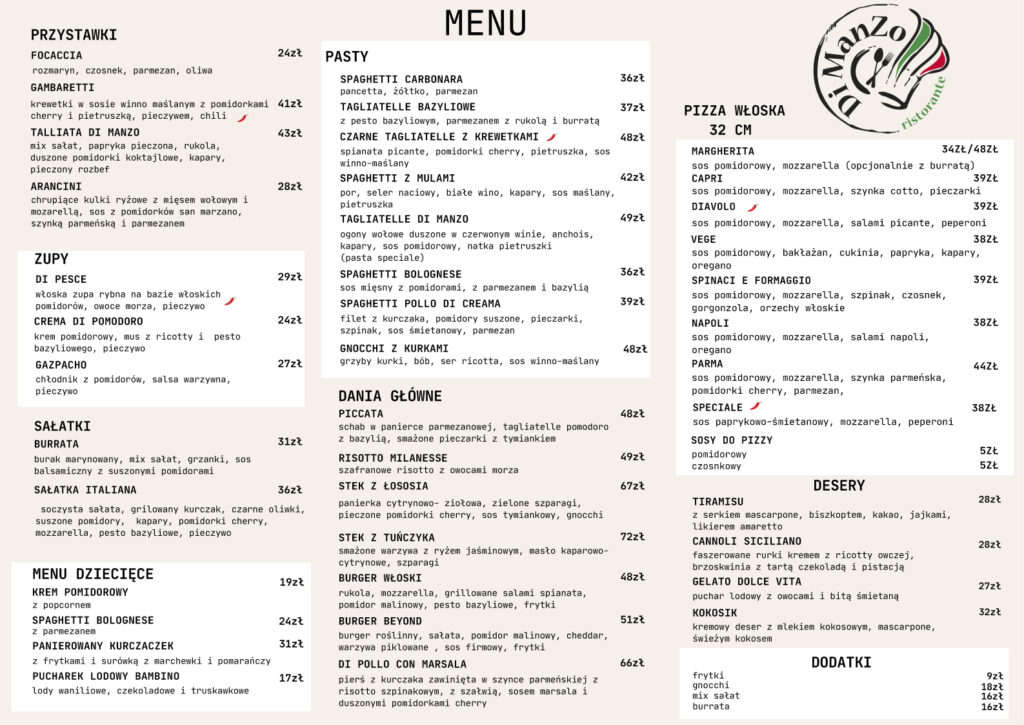 Specjalizujemy się w daniach mięsnych — „manzo” po włosku znaczy wołowina — ale nasza karta jest różnorodna. W menu znajdziesz pasty, pizzę w stylu neapolitańskim, owoce morza, zupy, przystawki i domowe desery. Dla dzieci mamy osobną sekcję, a dla dorosłych — włoskie wina, koktajle i dobrze zaopatrzony bar.